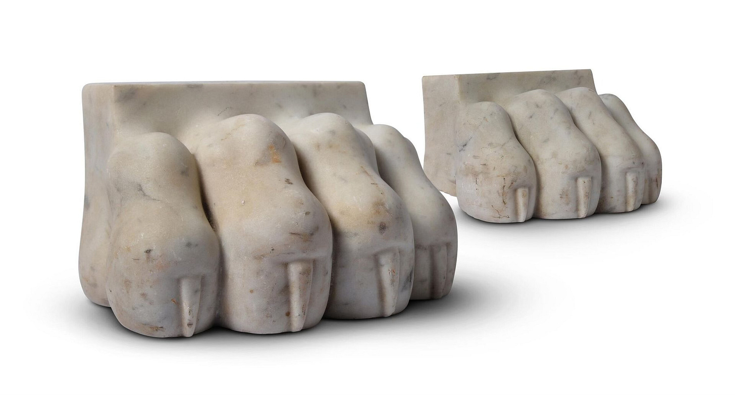A PAIR OF CARVED MARBLE LION PAWS IN THE GRAND TOUR MANNER, 20TH CENTURY · Starting Bid £200 · Dreweatts · May 7, 2025